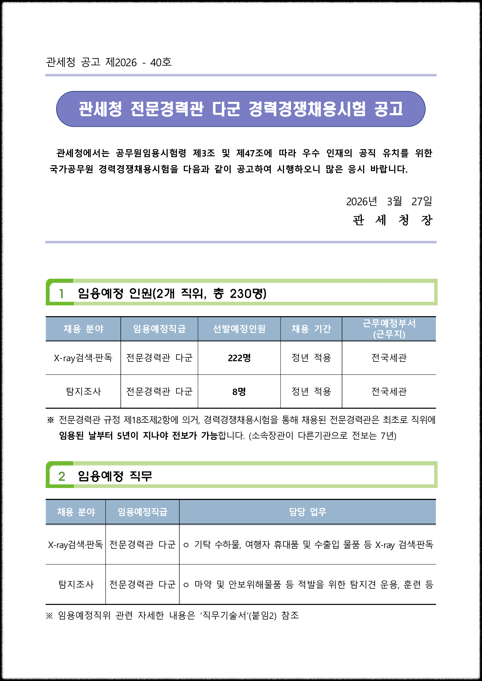 2026년 관세청 전문경력관 다군 경력경쟁채용시험 공고문입니다.